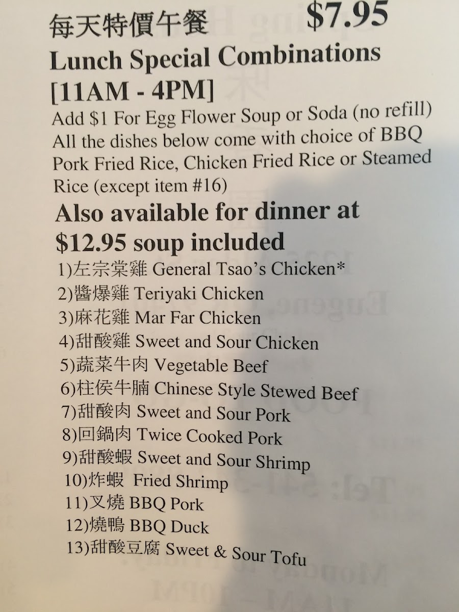 From a reviewer’s perspective, the menu at Spring House, located at 3712 1225 Alder St, Eugene, OR 97401, feels like a thoughtful summary of classic Chinese comfort food and Cantonese-style specialties, offering enough variety to satisfy both first-time visitors and regulars. The appetizer section sets the tone with familiar starters such as Pork Egg Rolls (3), Pot Stickers (10), BBQ Pork, Mar Far Chicken, and Fried Oyster, making it easy to begin the meal with crowd-pleasing flavors.